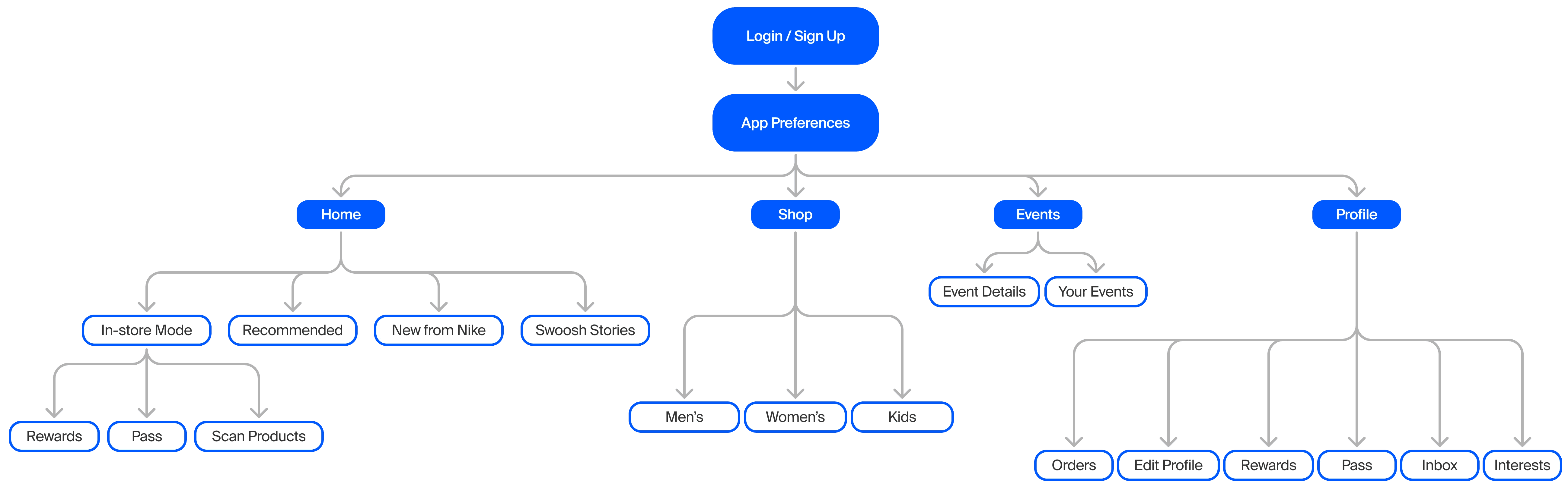 In laying out the information architecture, I wanted to prioritize a clear and straightforward navigation. Instead of five navigation menu items, it would be limited to four to reduce cognitive overload. The new events tab would host the user's registered events and their details and would become a more prominent feature within the app to boost future engagement with Nike-sponsored events.