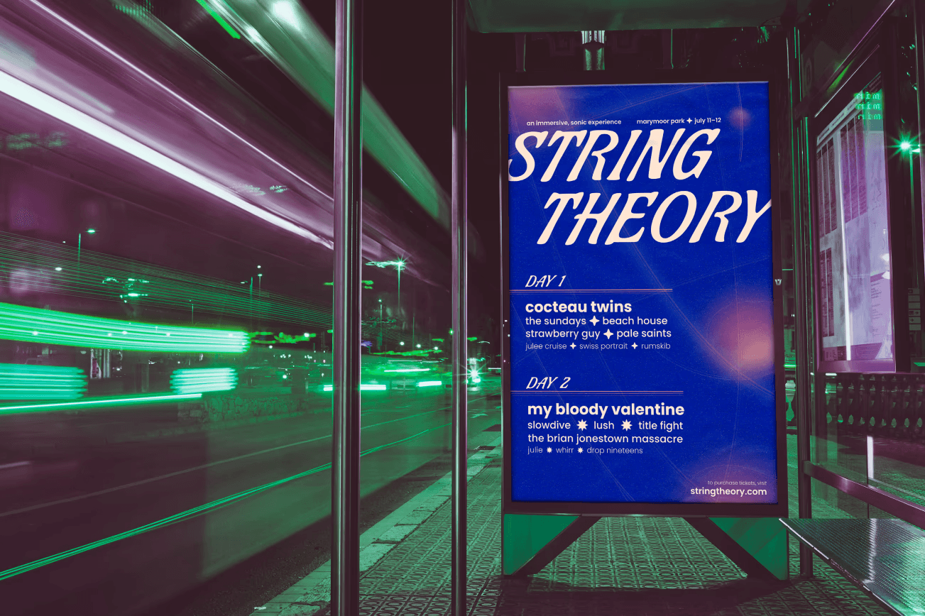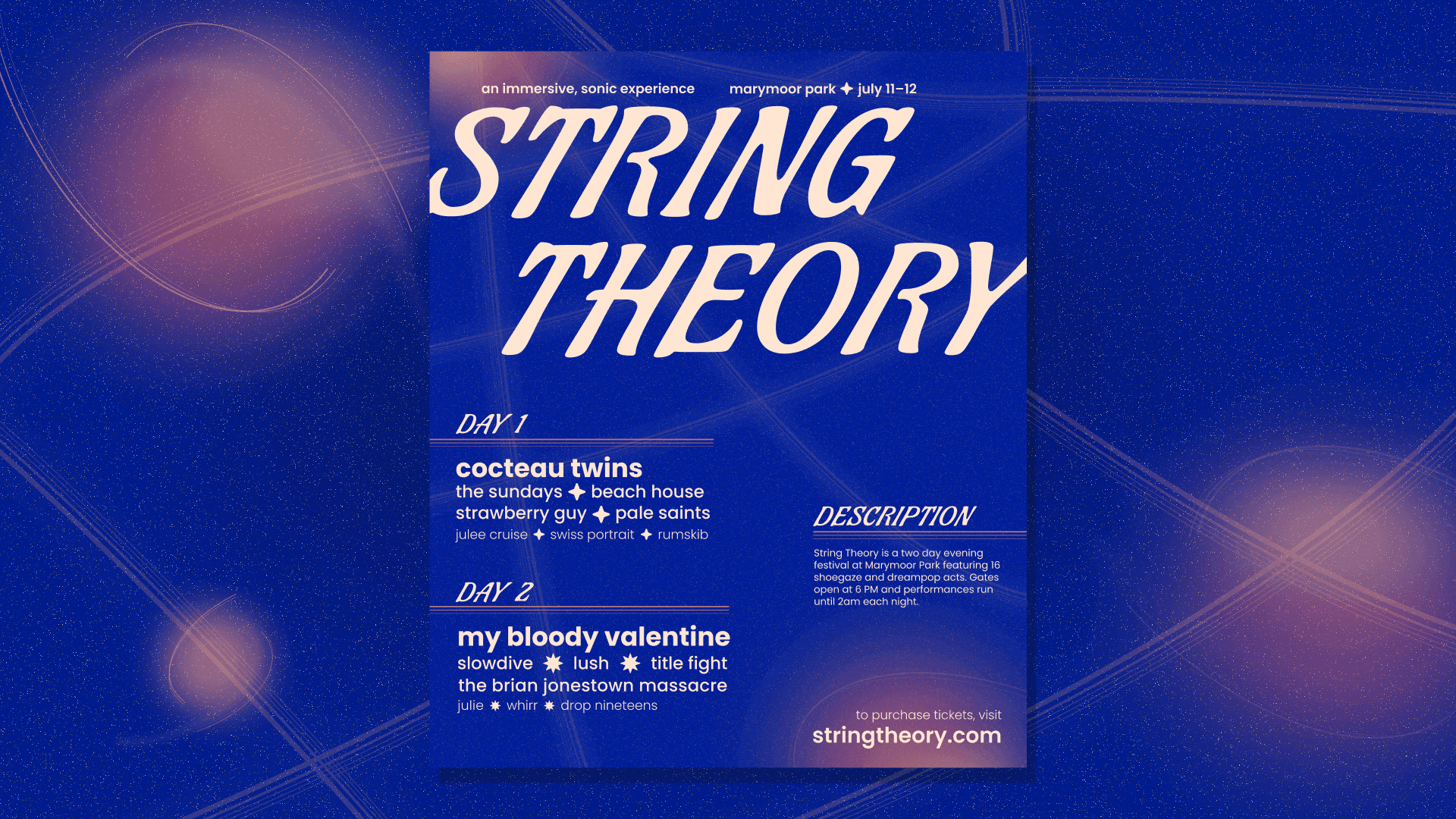 String Theory was part of a large, half-quarter class project where I was tasked with establishing the visual identity for an imaginary music festival that would feature music of my choice. The required deliverables included a poster, teaser video, environmental application, festival merchandise, and a festival accessory.